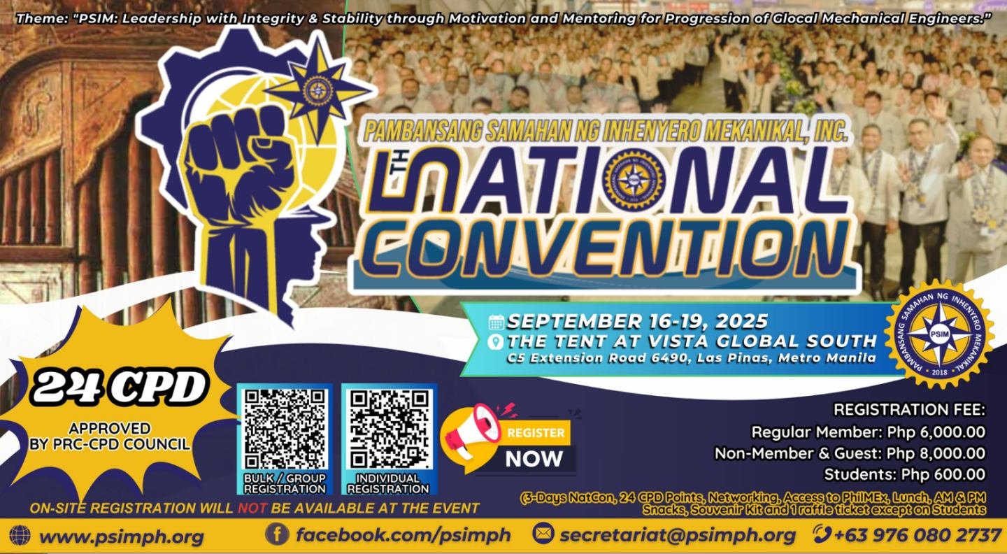 Our National Organization, The Pambansang Samahan ng Inhenyero Mekanikal, Inc. (PSIM), successfully held our 4th PSIM National Convention last September 17-19, 2024, and the 3rd Mechanical Engineering Student Conference (MESCON) last September 16, 2024, at The Tent at Villar City, with the Theme: “PSIM: A Convergence of Truth, Strength, and Knowledge for the Progression of Global Filipino Mechanical Engineers”.